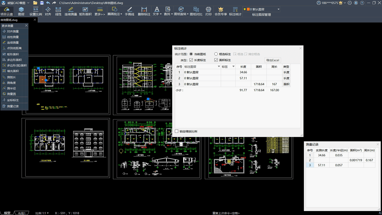 提供对齐、线性、连续测量、测角度、测弧长、测半径等功能,还可以测量任意边面积、矩形面积等,辅助捕捉追踪功能,实现精准测量